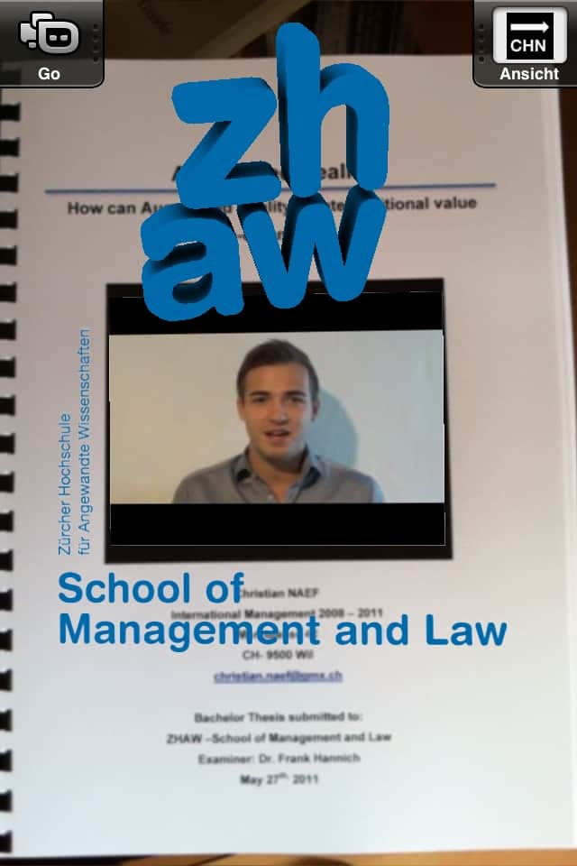 Christian Naef stellt sich dem Leser seiner Bachelorarbeit „How can Augmented Reality create additional Value in e-commerce?“ per Video vor. Im Channel „Christian Naef Bachelor Thesis“ kommen Videotextur, sowie ein statisches und animiertes Objekt zum Einsatz: